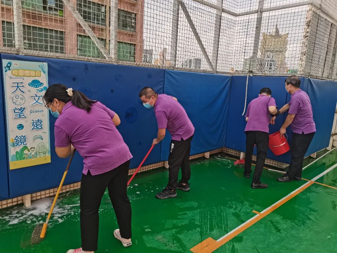為確保開學工作安全、順利、有序進行,後勤同事們從天臺到地下門口逐層清理,對校園四周開展大規模清潔與消毒,覆蓋課室、專用室、廚房、走廊、操場等全部區域。團隊還進行了滅蟲、滅蚊、清理積水、整理校園綠化等工作。廚房工作人員提前清洗用具、儲備糧油食材,並與清潔同事共同學習使用洗碗機,為師生的餐飲衛生提供堅實保障。