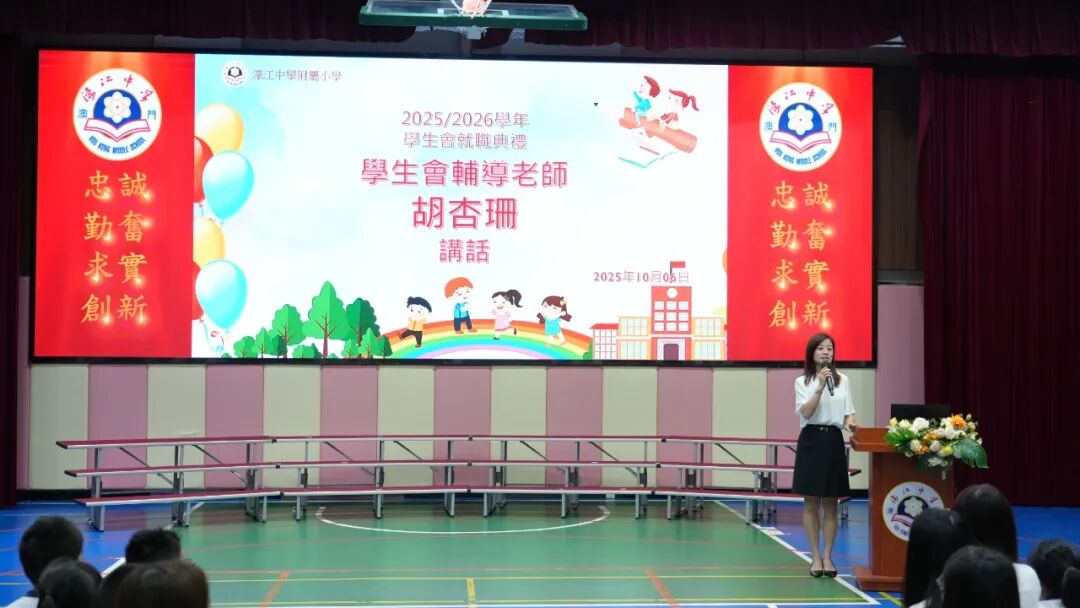 隨後,小學學生會輔導老師胡杏珊向新一屆學生會表示祝賀。她勉勵全體幹事,面對未來可能出現的挑戰,要以真誠態度對待每一位同學,以協作精神凝聚團隊力量,以責任擔當扛起工作使命,期待大家在各自崗位上發揮所長、閃耀光芒。