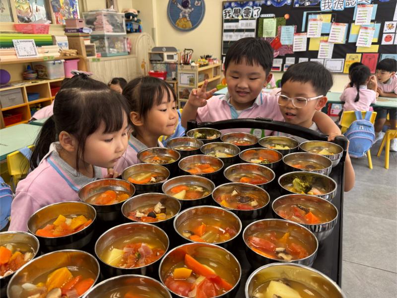 Before the soup activity, the teachers and children discussed the materials they needed to bring that day. Everyone excitedly suggested bringing all sorts of vegetables, including carrots, corn, tomatoes, and potatoes. The children couldn't wait for the day the soup was cooked. On the days when each class took turns cooking the vegetable soup, the corridor was always filled with a delicious aroma, making passersby stop and take a look.