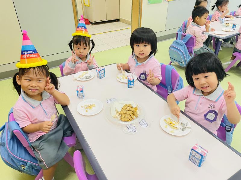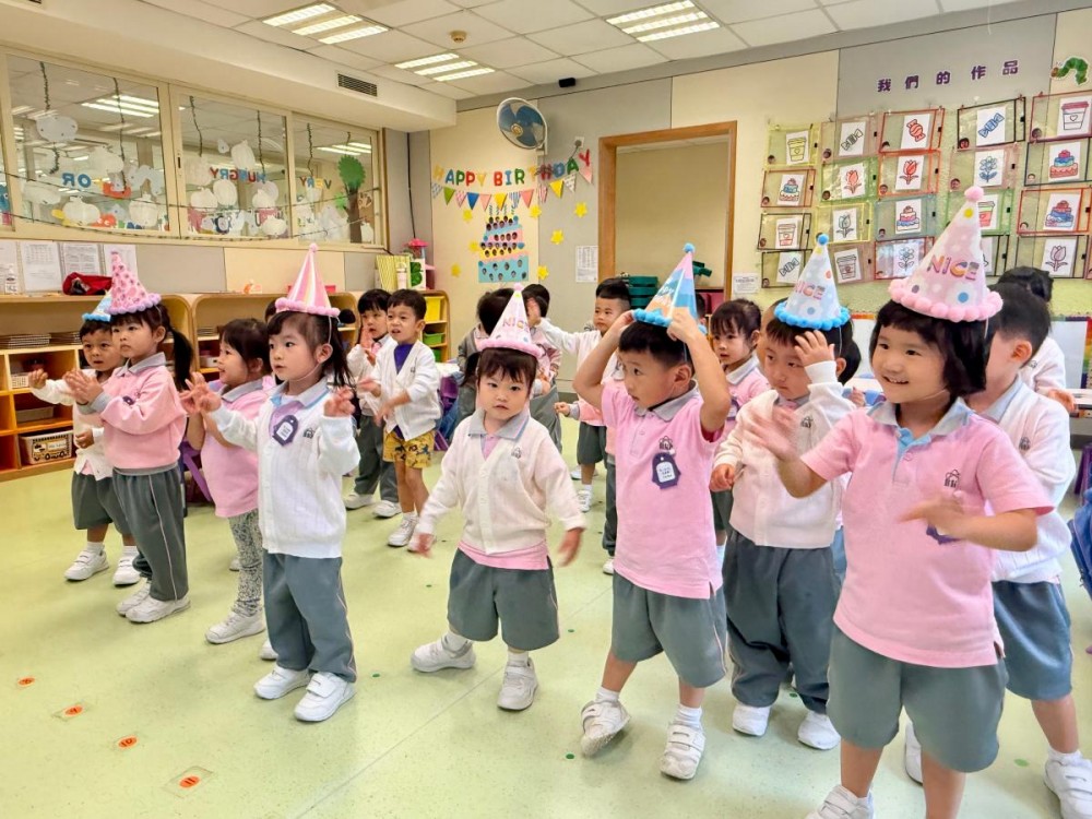 In K1, the children sat together, their innocent voices singing "Happy Birthday" to the birthday stars. Afterwards, they shared cake and healthy snacks, their faces beaming with happiness. In K2, the birthday celebrants dressed in their favorite costumes and brightly colored birthday hats, performing songs and dances with their classmates, filling the classroom with laughter and applause. The K3 children, wearing handmade birthday hats, confidently took to the stage to perform, singing "Happy Birthday" before sharing cake and snacks, enjoying a wonderful afternoon.