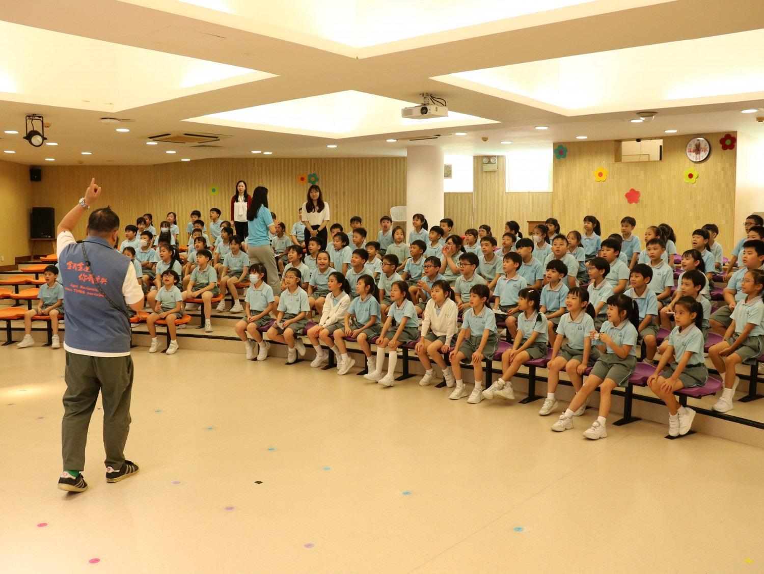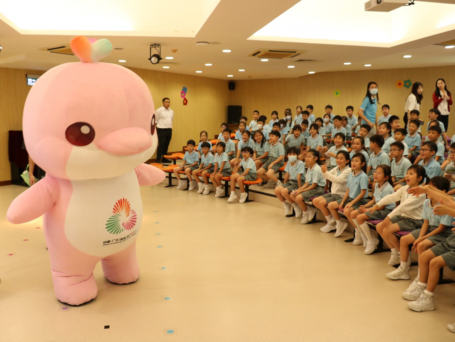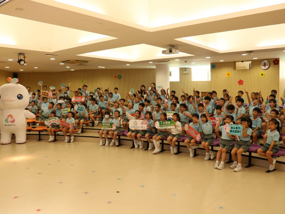 On September 18, 2025, Premier School Affiliated to Hou Kong Middle School was full of energy as the "Getting Close to the 15th National Games" series began with fun activities. The P3 students were introduced all about the 15th National Games. They learned about the event's location, logo, and the mascots. The mascots, Xiyangyang and Lerongrong, also joined the fun, and students were thrilled to interact with them and take photos.