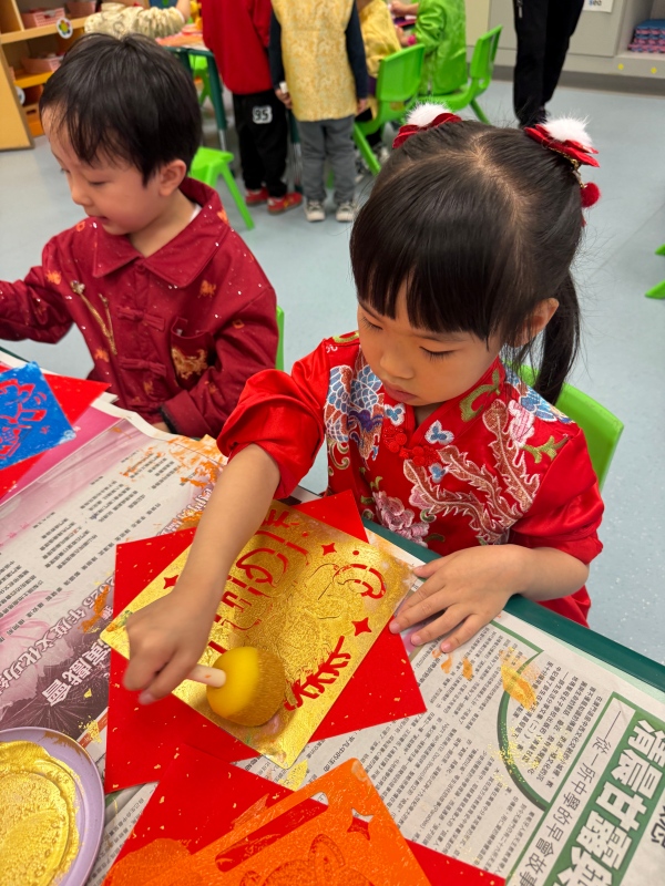為延續新春歡樂,各班級紛紛舉辦新年慶祝活動。K1的小朋友在課室裡玩各種趣味遊戲,並親手製作馬年美勞作品;K2級舉辦「串門」活動,孩子們穿上華麗的傳統服飾,穿梭各班挑戰「百發百中」、「新年送福」等攤位;K3級則在小禮堂舉行慶祝活動,透過舞獅、對聯遊戲及「傳福袋」接力等遊戲,讓孩子們在歡樂中認識傳統文化。
