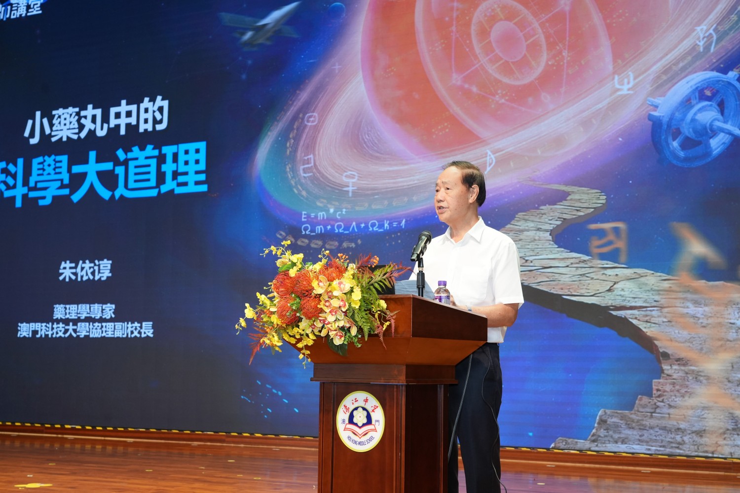 9月18日,由中國宋慶齡基金會主辦,澳門理工大學、國情教育(澳門)協會協辦的的“給孩子們的大師講堂”活動走進濠江中學附屬英才學校。本次活動邀請到國家重大研究計劃(973)首席科學家、歐洲科學與藝術院院士、澳門科技大學協理副校長、藥學院創院院長、澳門中華醫學會榮譽會長朱依諄先生蒞臨濠江英才,為同學們帶來一場聚焦學術前沿的專題講座——《小藥丸中的科學大道理》。