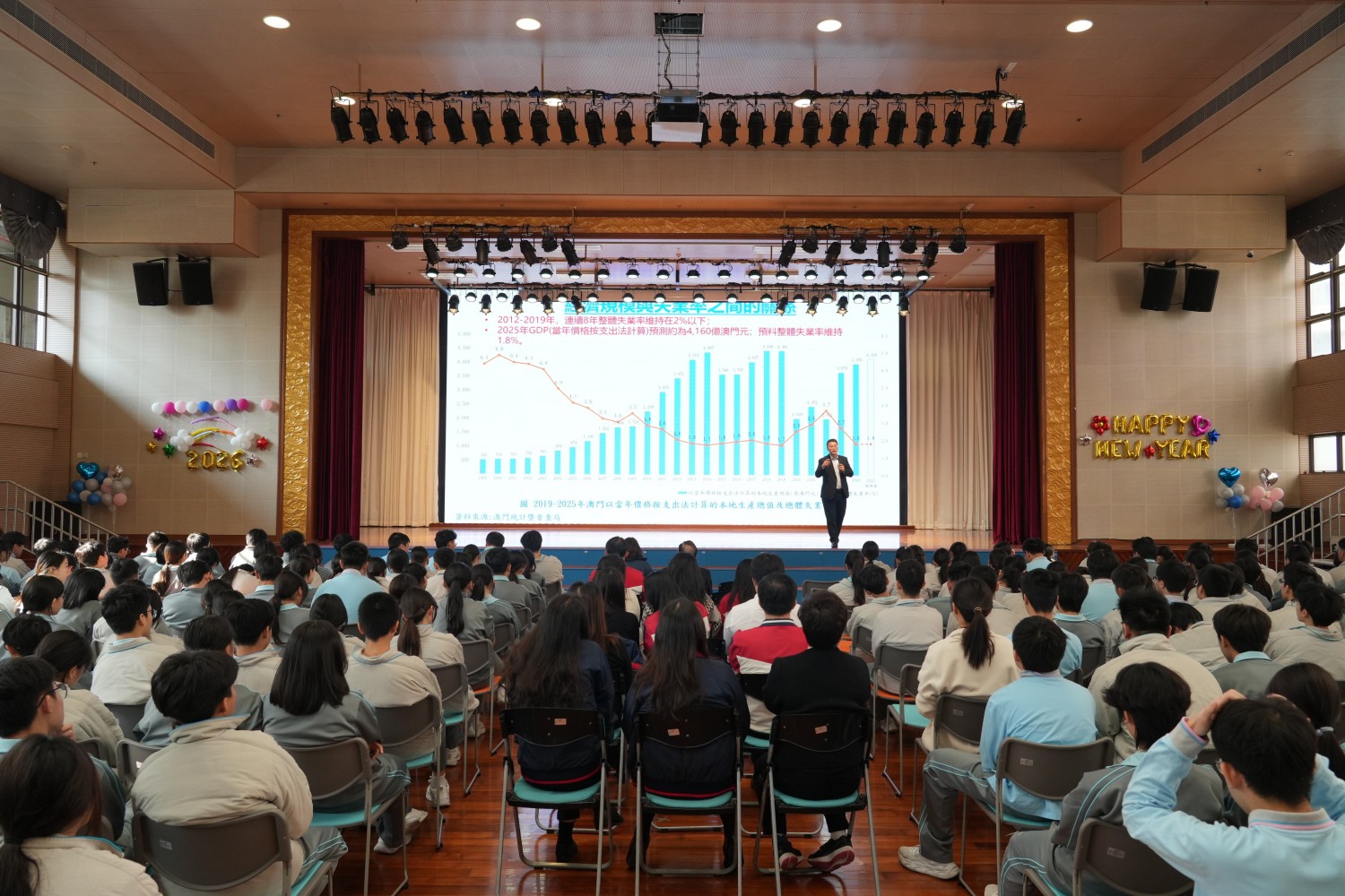 講座中,柳智毅博士以豐富的圖像與數據,生動對比澳門回歸前後的城市面貌與經濟社會發展。透過一幅幅今昔對比的照片,同學們直觀感受到回歸二十六年來,澳門在城市建設、公共設施及民生品質等方面的顯著提升。柳博士進一步以具體經濟數據說明,自1999年回歸以來,澳門本地生產總值大幅增長、人均收入持續上升,整體經濟實現跨越式發展,社會保持繁榮穩定。這些鮮活的對比,讓學生深刻體會到「一國兩制」方針的成功實踐與國家支持對澳門發展的關鍵作用。