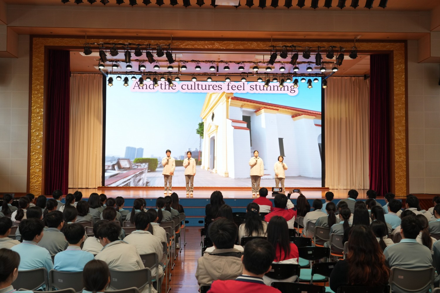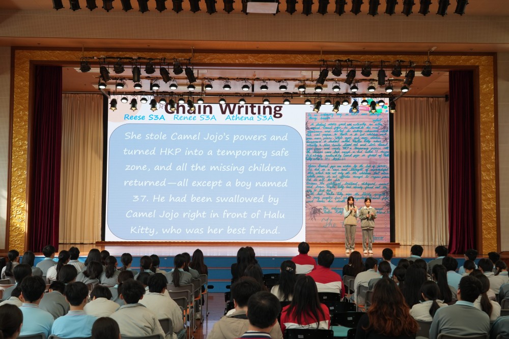 周會伊始,學校對在讀書節系列活動中表現優異的同學進行表彰。隨後,來自不同年級的學生代表真誠分享了他們參與讀書節活動的收穫和感悟。同學們分別以中、英文展示精美的手制書簽與創意十足的故事接龍,暢談閱讀帶來的啟發。才藝展演環節,同學們以英文改編歌曲,歌詞融合澳門本地文化元素,將閱讀與人文情懷生動結合。話劇《范進中舉》與英文話劇《The Wizard of Oz》的先後上演,更將現場氣氛推向高潮。同學們以精湛演技詮釋經典,充分顯示他們不僅深入理解文本,更具備了跨文化演繹與團隊協作的能力。