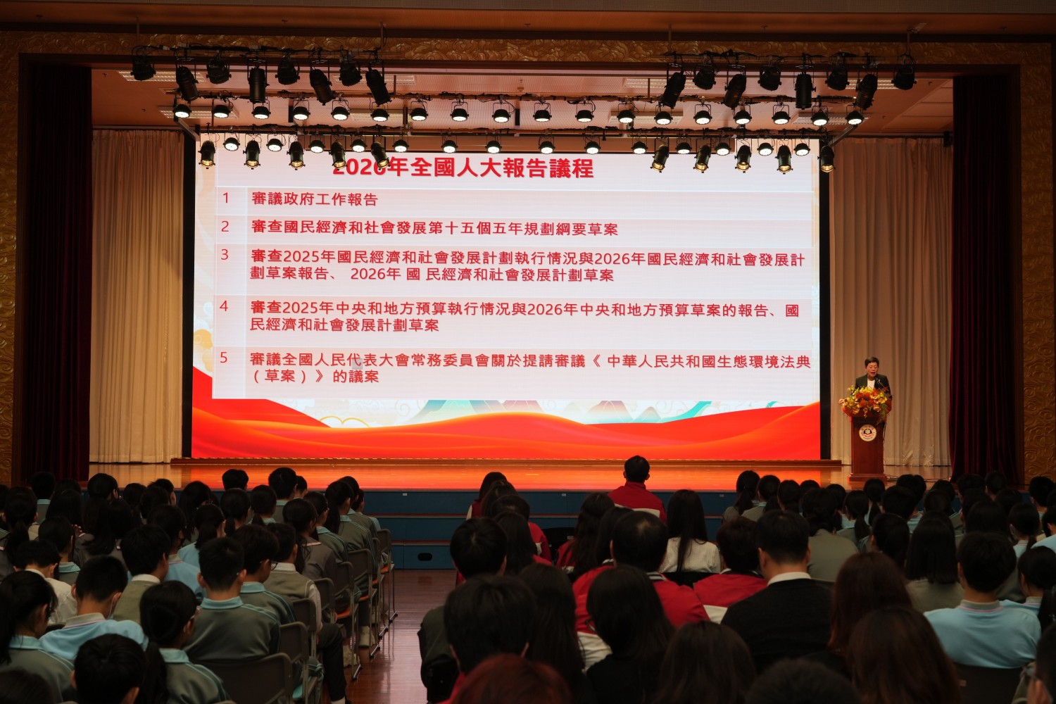 為增加師生對國家發展動向的瞭解,深入學習“兩會”精神,3月24日,澳區全國人大代表、濠江中學陳虹副校長為濠江英才師生帶來一場聚焦“兩會”精神的專題分享會,全體師生接受了一次深刻的愛國主義教育。