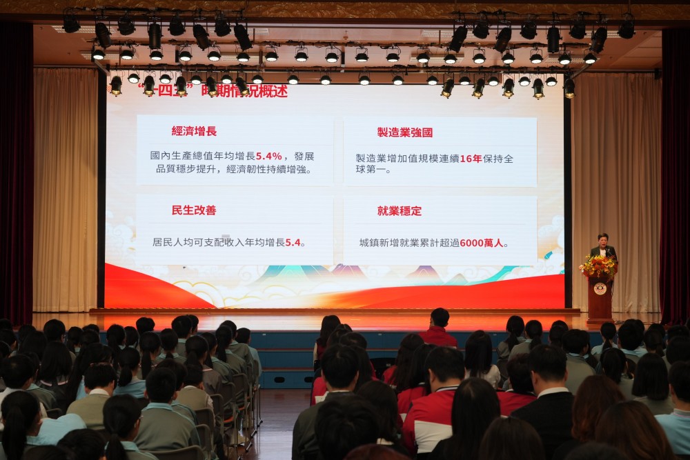 分享會尾聲,陳校長以影片帶領同學們展望五年後的國家發展藍圖。陳校長藉此寄語師生,要“把握現在,擁抱未來”,融入並服務國家大局時不我待。全體師生要立足當下、腳踏實地,將個人成長與國家所需緊密結合,以扎實學識與堅定信念,為澳門繁榮穩定與祖國偉大復興貢獻青春力量。