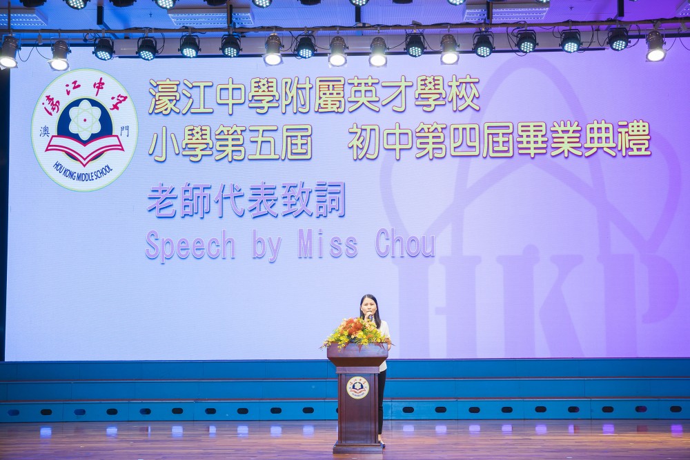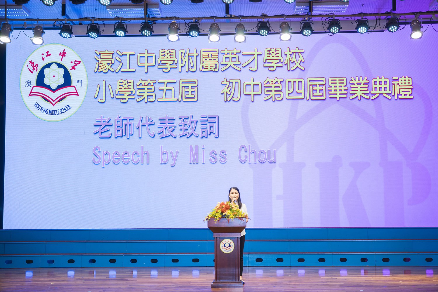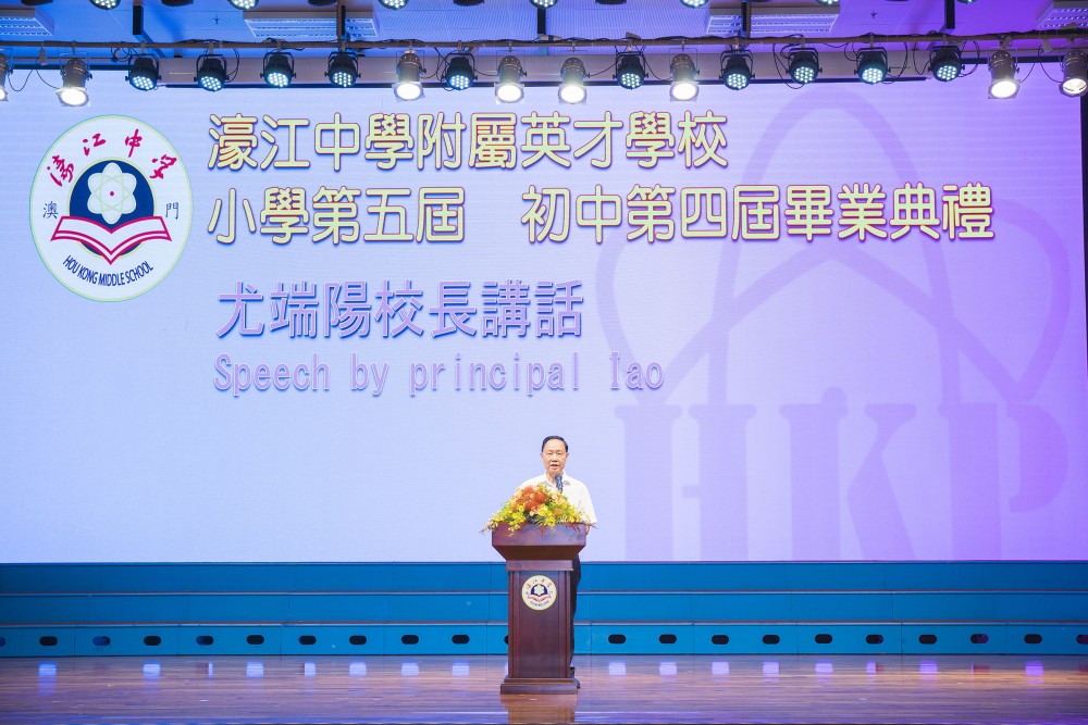 濠江中學校長尤端陽向一百零三名小學畢業生及八十名初中畢業生表示熱烈的祝賀。他回顧了2019學年值得濠江人驕傲的事:習近平主席不僅給英才小朋友回信,還親臨英才學校視察、觀課並發表重要講話;濠江師生參與了《開學第一課》、《少年說》節目的錄製;今年初,杜嵐校長與其被評為2019年度十大感動中國人物。