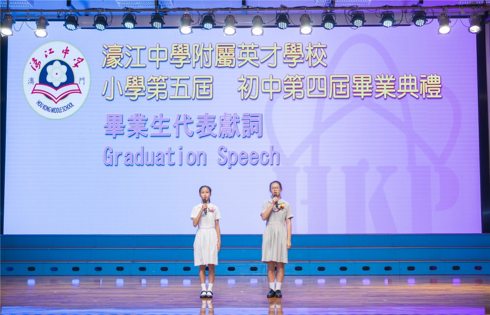 典禮中,還有畢業班學生溫伊曈、鄭語涵發言。她們表達了學子們對祖國、學校、老師及家長的感恩之情。她們表示會謹記習爺爺的話,傳承好愛國愛澳的優良傳統,牢記社會責任,珍惜時光,刻苦學習,長大後為建設澳門、振興中華多作貢獻。