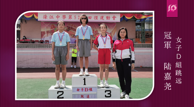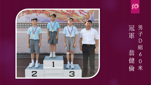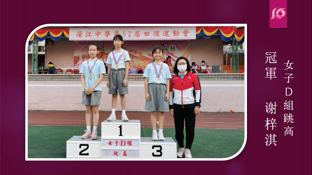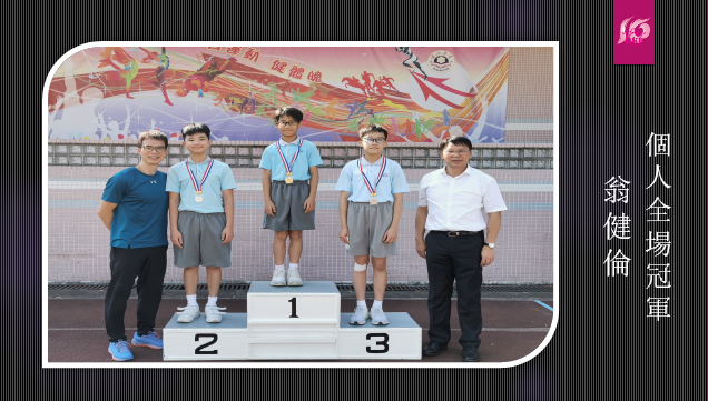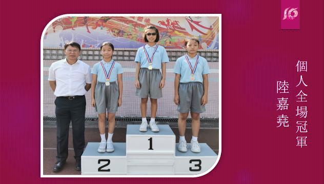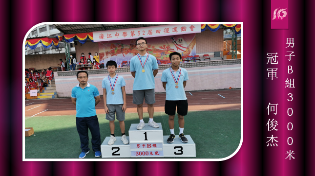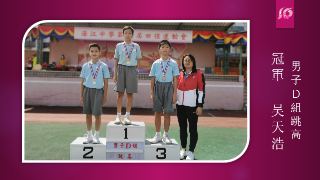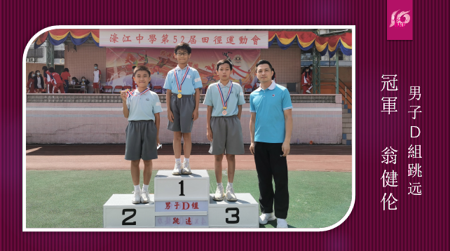在本屆運動會上,濠江英才校部P6B獲男子D組團體冠軍,P6D獲女子D組團體冠軍,P4C獲女子E組團體冠軍。翁健倫同學勇奪男子D組個人全場冠軍;陸嘉堯同學勇奪女子D組個人全場冠軍;黃茹琪同學勇奪女子C組個人全場冠軍。在此次校運動會中英才校部共取得了 25項冠軍,46項亞軍及 41項季軍的好成績。