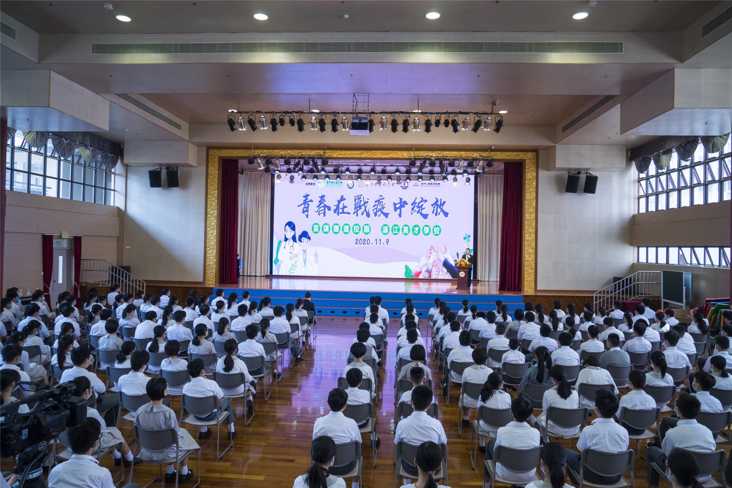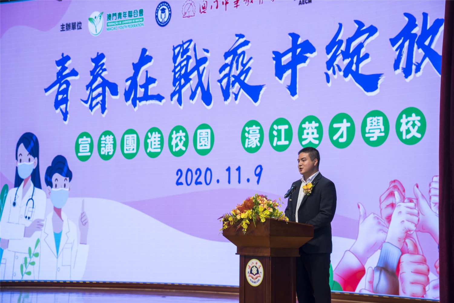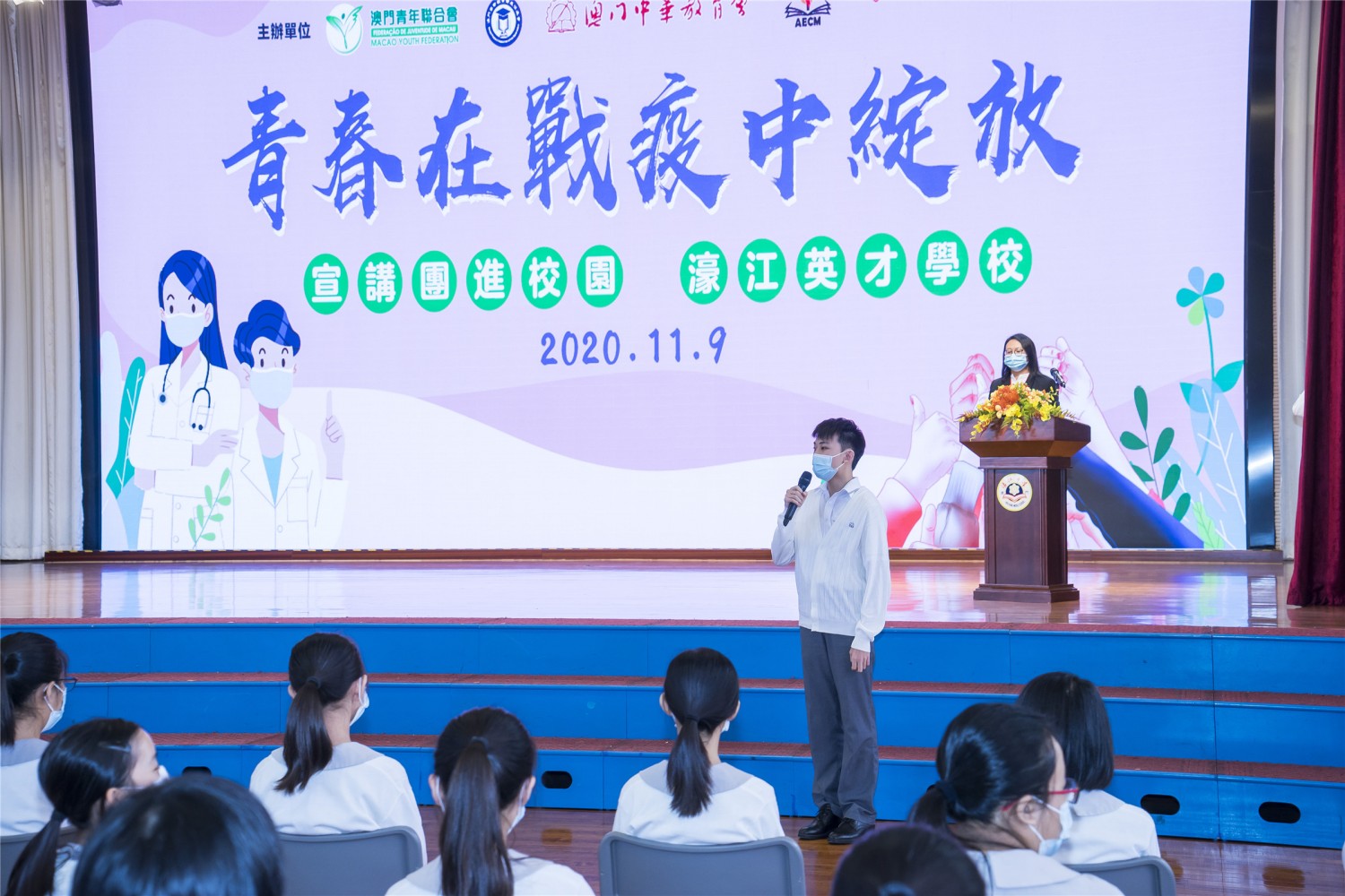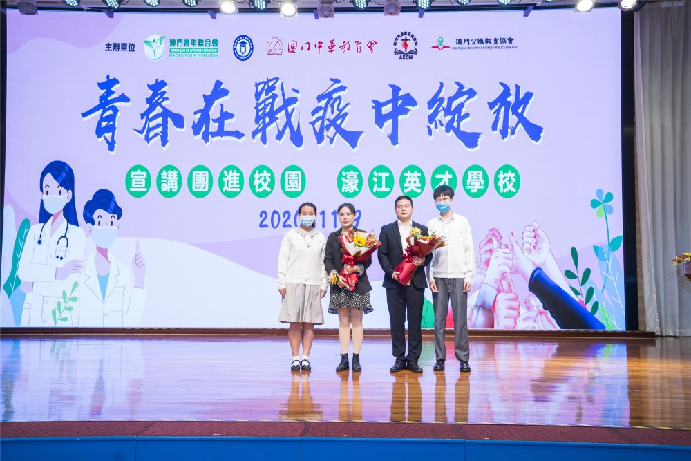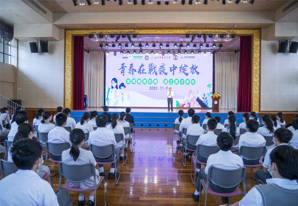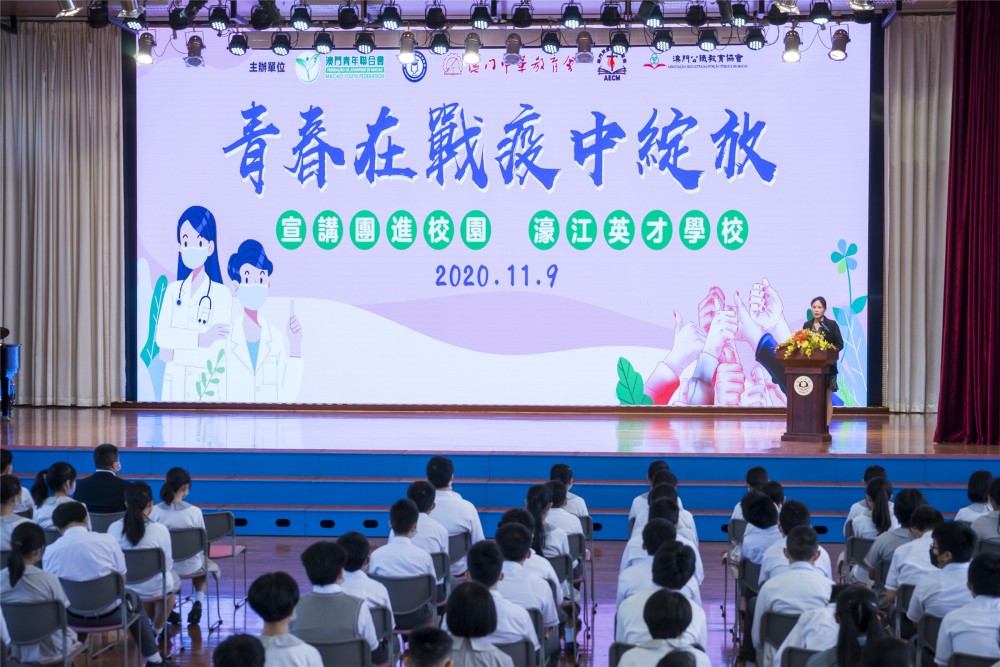 澳門青年聯合會、澳門高等教育發展促進會、澳門中華教育會、澳門天主教學校聯會、澳門公職教育協會聯合組織的“青春在戰疫中綻放” 澳門宣講報告會首場入校園宣講活動11月9日上午在濠江中學附屬英才學校舉行,受到全校師生的熱烈歡迎。