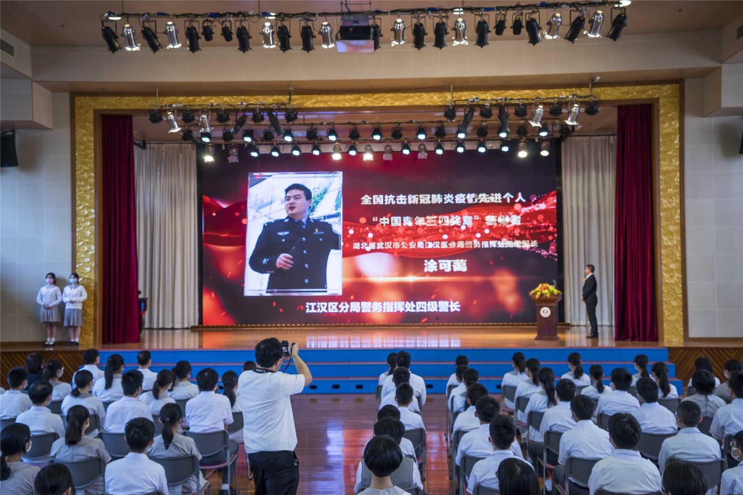 宣講會上,新冠肺炎康復後重返工作崗位的武漢民警塗可藹、創造出武漢無一人感染社區神話的芳草社區代表杜雲,兩位宣講團成員向濠江英才師生講述了自己積極投身抗疫一線的奮鬥故事,真情闡釋了“生命至上、舉國同心、捨生忘死、尊重科學、命運與共”的偉大抗疫精神,引起了全場師生強烈的反響。