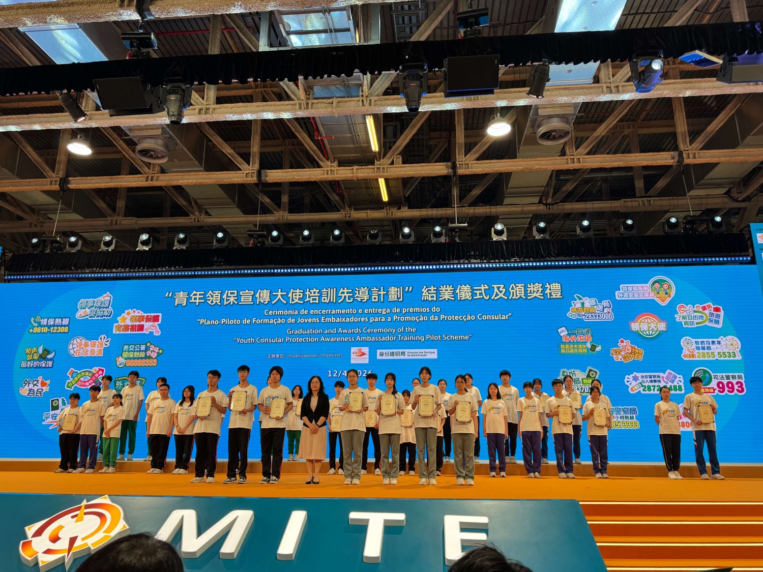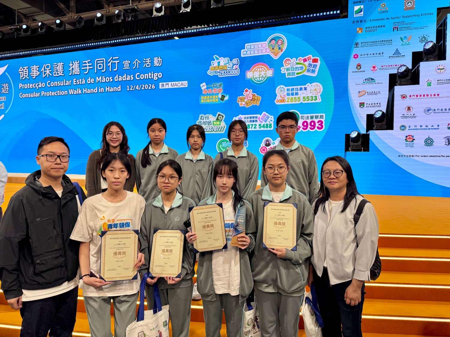 4月12日,由中華人民共和國外交部駐澳門特別行政區特派員公署、身份證明局、旅遊局合辦的"平安澳遊宣介活動",於澳門威尼斯人金光會展展館舉行。宣介活動同時舉行“青年領保宣傳大使培訓先導計劃”結業禮,共同見證來自本澳6間中學的45名完成培訓的學員正式成為領保宣傳大使,肩負起將領保知識接力傳遞的使命。該計劃由身份證明局與外交公署首次共同舉辦,目的是培養青年學生成為領保宣傳大使,傳播領保知識,共同提升居民的外遊安全防範意識和能力。濠江英才S5B胡曉嵐、李穎晴、李凱雯、曾懿琳積極參與本次計劃,取得優異成績,其作品榮獲優異獎(最高獎項),指導教師為古加威老師。